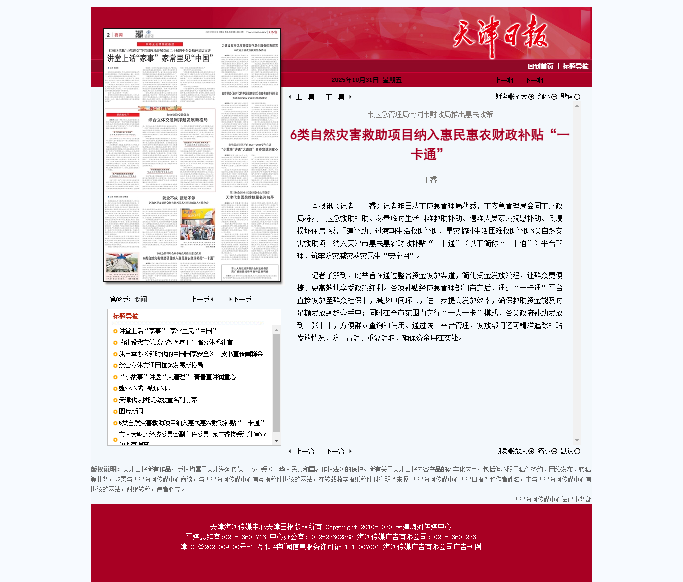 【天津日报】6类自然灾害救助项目纳入惠民惠农财政补贴“一卡通”