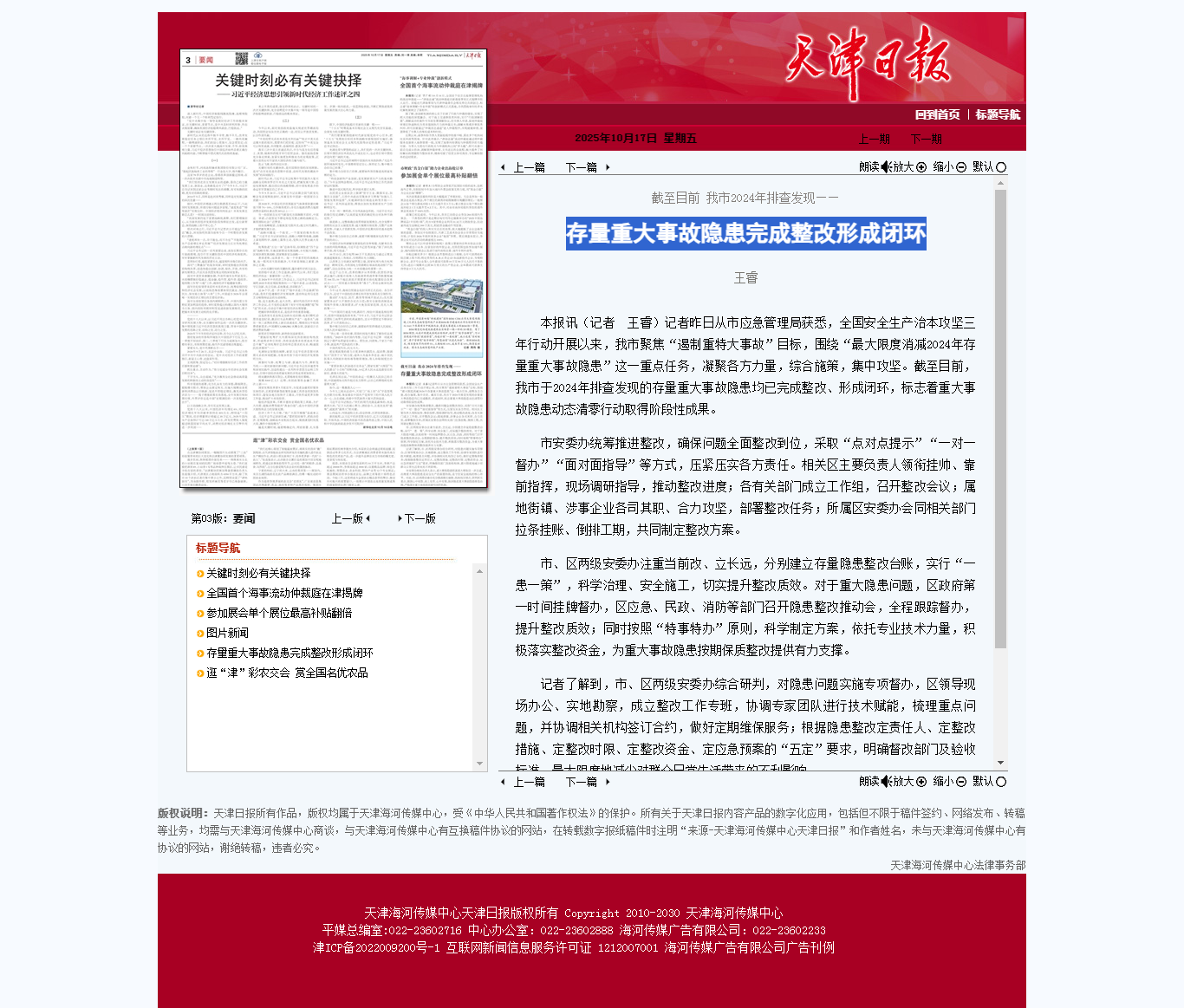 【天津日报】存量重大事故隐患完成整改形成闭环